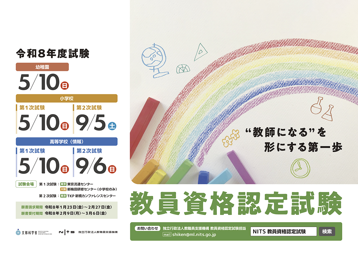 2026年2月6日 令和8年度教員資格認定試験の願書請求期間(令和8年1月23日(金曜日)~2月27日(金曜日))が始まりました 当機構では、文部科学省が実施する「教員資格認定試験」の事務を担当してい... 続きを読む