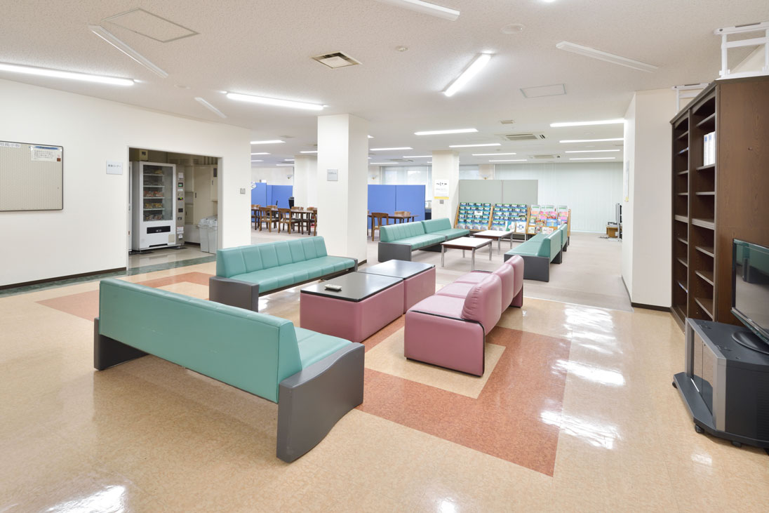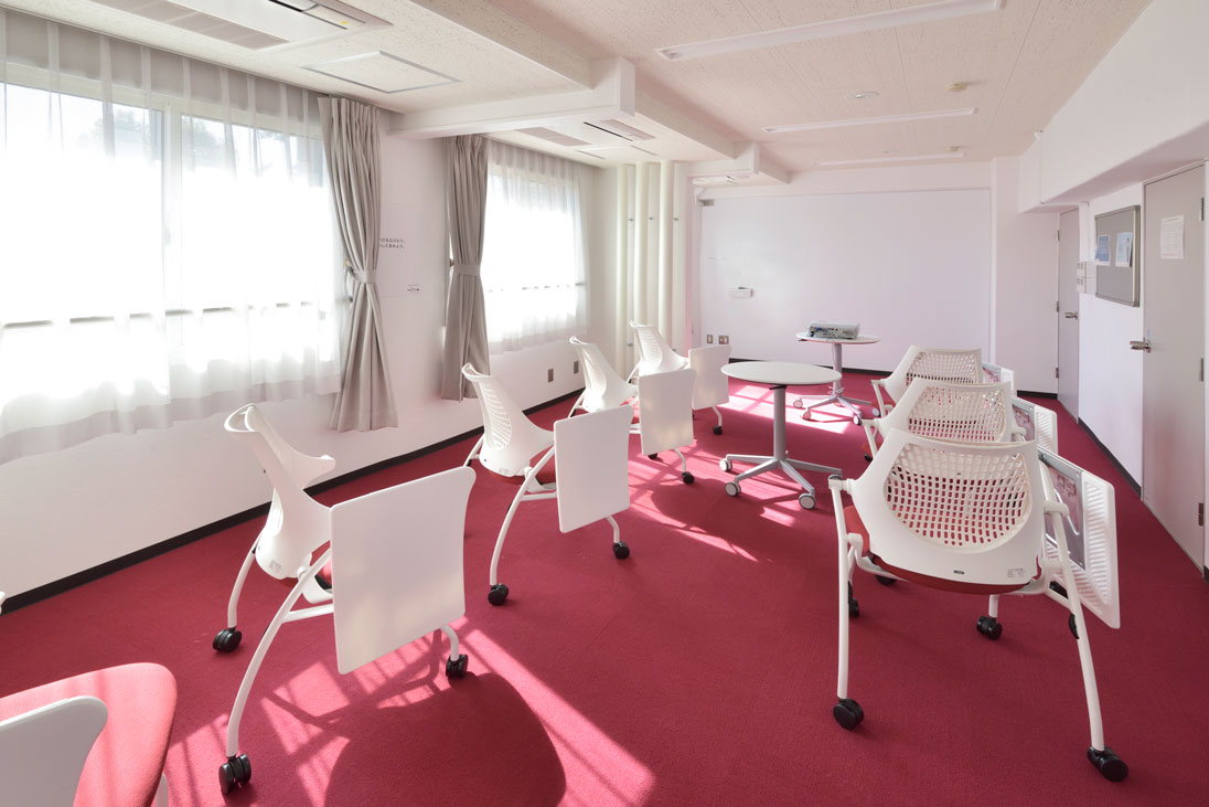 歓談スペースとなるプラザホール、ユニット(グループ)ミーティング等を行う特別研修室と談話室3室、印刷室、多目的室1があります。他にも宅配便コーナーや資料棚など自由に利用できる設備もあります。 |