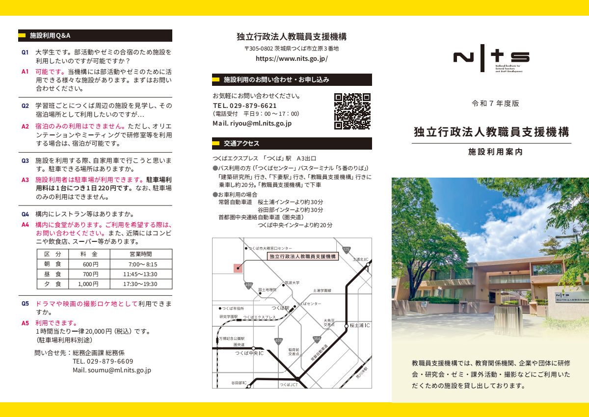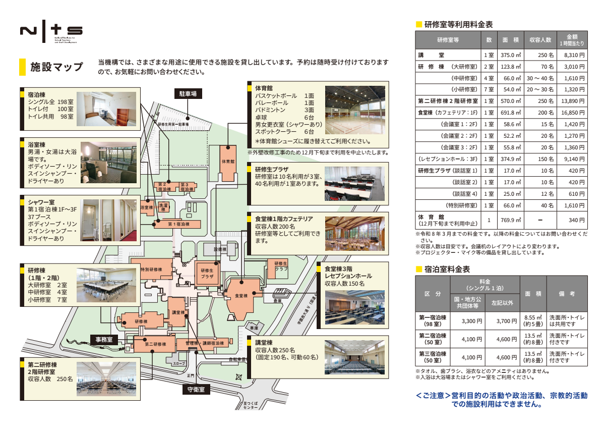 ただし、営利を目的とした活動、政治的な活動及び宗教的な活動、宿泊施設のみの利用はできません。教職員支援機構では、国(独立行政法人を含む)、地方公共団体、教育関係機関等が行う営利を目的としない研修その他の活動に対し、スケジュール等の許す範囲で、施設の貸出を行っております。