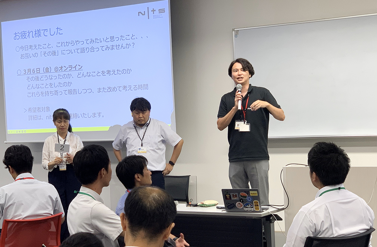今、楽しく夢中で働いているので「夢中」です。研修に対して、こだわってもいいかなと思うようになって、どうこだわるかを夢中で考えるようになりました。NITSの研究職の職員と話す中で、「探究型研修をどう発展させていくべきか」を問うことができたりもしました。自分たちのような人事交流の職員は2~3年で所属元に戻ってしまうので、戻った後にその思いを引き継いで、改善し続けていくことが大事だと思っています。